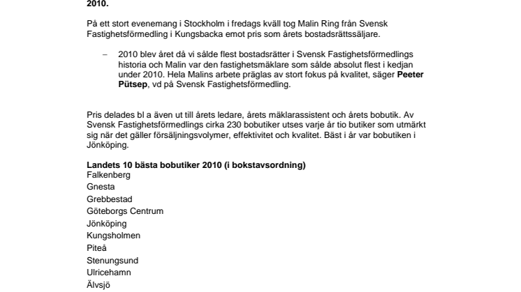 - 2010 blev året då vi sålde flest bostadsrätter i Svensk Fastighetsförmedlings historia och Malin var den fastighetsmäklare som sålde absolut flest i kedjan under 2010. Hela Malins arbete präglas av stort fokus på kvalitet, säger Peeter Pütsep, vd på Svensk Fastighetsförmedling.