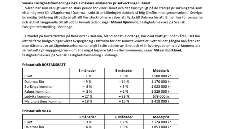– Våren har som vanligt varit en stark period för villor i länet och det syns tydligt på de stadiga prisökningarna. Det råder högtryck på villapriserna i Dalarna och i snitt är prisökningen dubbelt så hög jämfört med genomsnittet i Sverige. En möjlig förklaring till detta är att allt fler stockholmare väljer att flytta till Dalarna för att få mer hus för pengarna och istället långpendla till sina jobb i huvudstaden, säger Mikael Björklund, fastighetsmäklare på Svensk Fastighetsförmedling i Borlänge.
