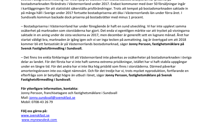 – Bostadspriserna i Västernorrland har under föregående år haft en sund utveckling. Vi har inte upplevt samma osäkerhet på marknaden som storstäderna har gjort. Det enda vi egentligen märkte var att trycket på visningarna saktade in en aning under de sista veckorna av 2017, men december är generellt sett en lugnare månad. Året har startat väldigt bra, marknaden är igång igen och vi ser inga tecken på avmattning. Jag är övertygad om att 2018 kommer bli ett fantastiskt år på Västernorrlands bostadsmarknad, säger Jonny Persson, fastighetsmäklare på Svensk Fastighetsförmedling i Sundsvall.