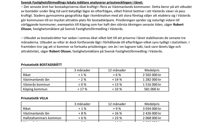 – Utbudet av bostadsrätter har sedan i somras ökat vilket lett till att priserna i länet stabiliserats de senaste tre månaderna. Utbudet av villor är dock fortfarande lågt i förhållande till efterfrågan vilket syns tydligt i statistiken. I framtiden tror jag att vi kommer se fortsatta prisökningar, om än i en lugnare takt, tack vare länets läge och attraktivitet, säger Robert Olsson, fastighetsmäklare på Svensk Fastighetsförmedling i Västerås.