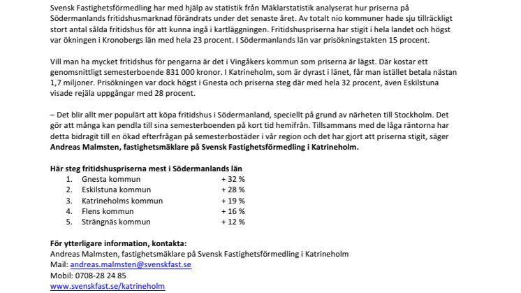 Svensk Fastighetsförmedling har med hjälp av statistik från Mäklarstatistik analyserat hur priserna på Södermanlands fritidshusmarknad förändrats under det senaste året. Av totalt nio kommuner hade sju tillräckligt stort antal sålda fritidshus för att kunna ingå i kartläggningen. Fritidshuspriserna har stigit i hela landet och högst var ökningen i Kronobergs län med hela 23 procent. I Södermanlands län var prisökningstakten 15 procent.