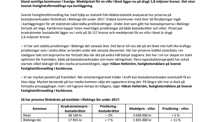 Svensk Fastighetsförmedling har med hjälp av statistik från Mäklarstatistik analyserat hur priserna på bostadsmarknaden förändrats i Blekinge län under 2017. Endast kommuner med över 50 försäljningar ingår i kartläggningen för att statistiskt säkerställa prisförändringar. Under året som gått har bostadspriserna i Blekinge fortsatt att stiga. Karlskrona toppar listan med högst prisökningar på både bostadsrätter och villor. Priset per kvadratmeter bostadsrätt ligger nu i snitt på 26 117 kronor och medelpriset för en villa i länet är drygt 2,6 miljoner kronor.