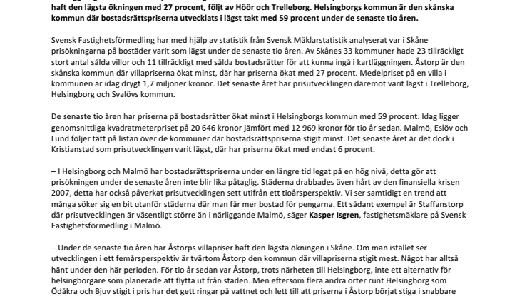 Bostadspriserna har under de senaste tio åren stigit rejält runt om i Skåne. Men var har prisutvecklingen på villor och bostadsrätter varit som lägst i länet? Svensk Fastighetsförmedling har med hjälp av Mäklarstatistik gjort en kartläggning över var bostadspriserna stigit minst de senaste tio åren. Åstorp är den kommun där villapriserna har haft den lägsta ökningen med 27 procent, följt av Höör och Trelleborg. Helsingborgs kommun är den skånska kommun där bostadsrättspriserna utvecklats i lägst takt med 59 procent under de senaste tio åren.
