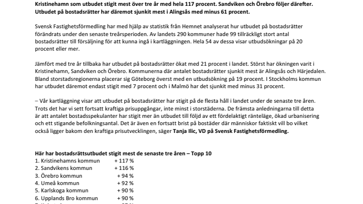 – Vår kartläggning visar att utbudet på bostadsrätter har stigit på de flesta håll i landet under de senaste tre åren. Trots det har vi sett fortsatt kraftiga prisuppgångar, inte minst i storstäderna. De främsta anledningarna till detta är att antalet bostadsspekulanter har stigit mer än utbudet till följd av ett fördelaktigt ränteläge, ökad urbanisering och ett stigande befolkningsantal. Det är även en fortsatt brist på bostäder där människor faktiskt vill bo vilket också ligger bakom den kraftiga prisutvecklingen, säger Tanja Ilic, VD på Svensk Fastighetsförmedling.