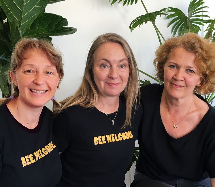 Från vänster Lotta Fabricius Kristiansen, biodlare och projektledare för Svenska Bin. I mitten Ulla Tillgren, pressansvarig och till höger Anna Lind Lewin, ansvarig för marknad och kommunikation.