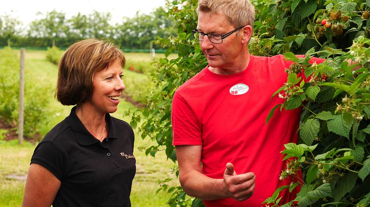 – Hallonplantan blommar under 5–6 veckor och under den perioden måste vi ha rikligt med pollinatörer, så det är suveränt för oss att ha bisamhällen här i odlingen. I gengäld så vet Viktoria att det finns god tillgång på hallonblommor, som bina tycker mycket om, från mitten av maj till mitten av augusti, säger Johan. Han betonar att det är viktigt att ha en god relation med sin biodlare, så att man tillsammans kan komma fram till hur både biodling och odling av gröda och frukt kan bli maximalt effektiv. Både bin och hallon är till exempel känsliga för blåst, så vindskydd är viktigt.