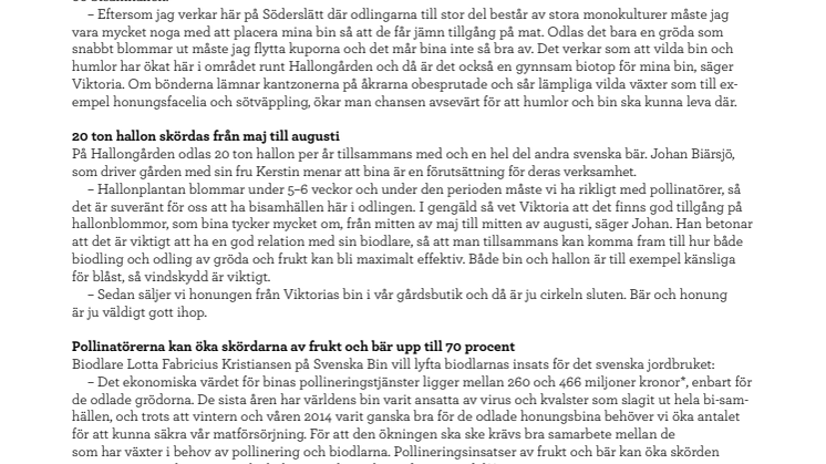På Hallongården odlas 20 ton hallon per år tillsammans med en hel del andra svenska bär. Johan Biärsjö, som driver gården med sin fru Kerstin menar att bina är en förutsättning för deras verksamhet.