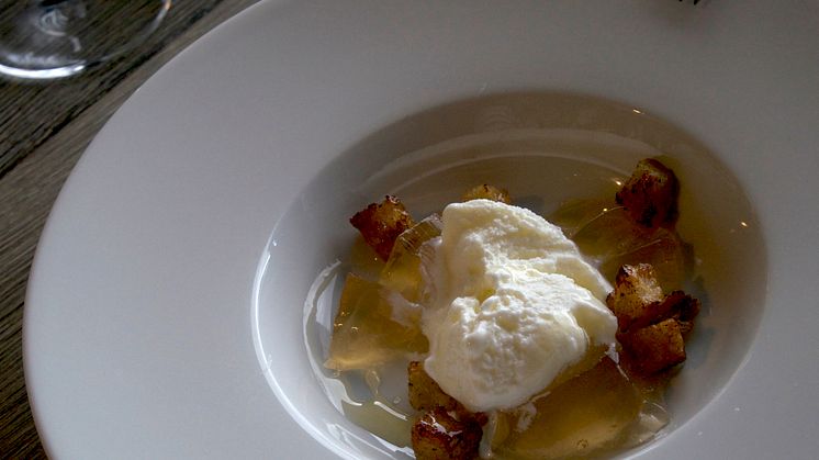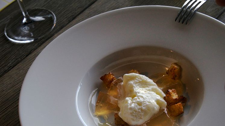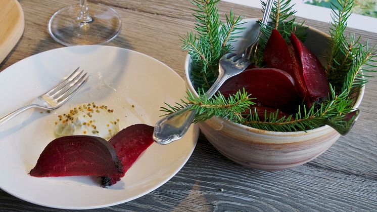 Vi börjar med lättrökta rödbetor med honung, granost och bipollen fortsätter med honungsrostad spetskål och ägg i fläskbuljong och avslutar med honungsorbet och levainbröd med te.