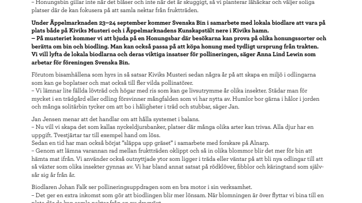När Äppelmarknaden går av stapeln 23–24 september kommer Svenska Bin och lokala biodlare att vara på plats både på Kiviks Musteri och i marknadens Kunskapstält nere i Kiviks hamn.
