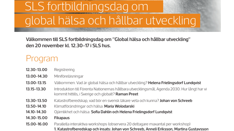 Svenska Läkaresällskapet (SLS) välkomnar till SLS fortbildningsdag om "Global hälsa och hållbar utveckling" den 20 november kl. 12.30-17.00 i SLS vackra Karolina Widerströmsal.