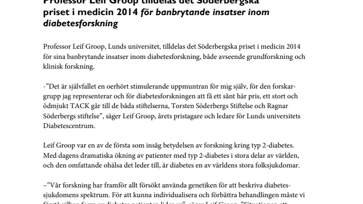 -”Det är självfallet en oerhört stimulerande uppmuntran för mig själv, för den forskargrupp jag representerar och för diabetesforskningen att få ett sånt här pris, ett stort och ödmjukt TACK går till de båda stiftelserna, Torsten Söderbergs Stiftelse och Ragnar Söderbergs stiftelse”, säger Leif Groop, årets pristagare och ledare för Lunds universitets Diabetescentrum.