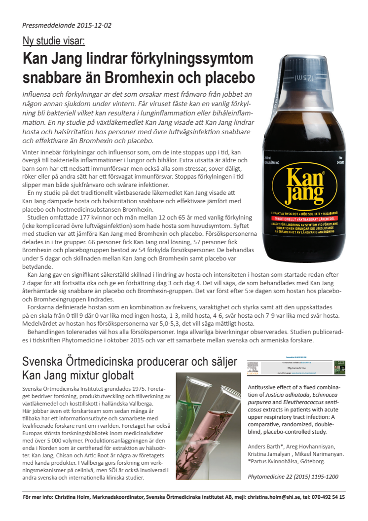 Influensa och förkylningar är det som orsakar mest frånvaro från jobbet än någon annan sjukdom under vintern. Får viruset fäste kan en vanlig förkylning bli bakteriell. En ny studie på växtläkemedlet Kan Jang visade att Kan Jang lindrar hosta och halsirritation hos personer med övre luftvägsinfektion snabbare och effektivare än Bromhexin och placebo.