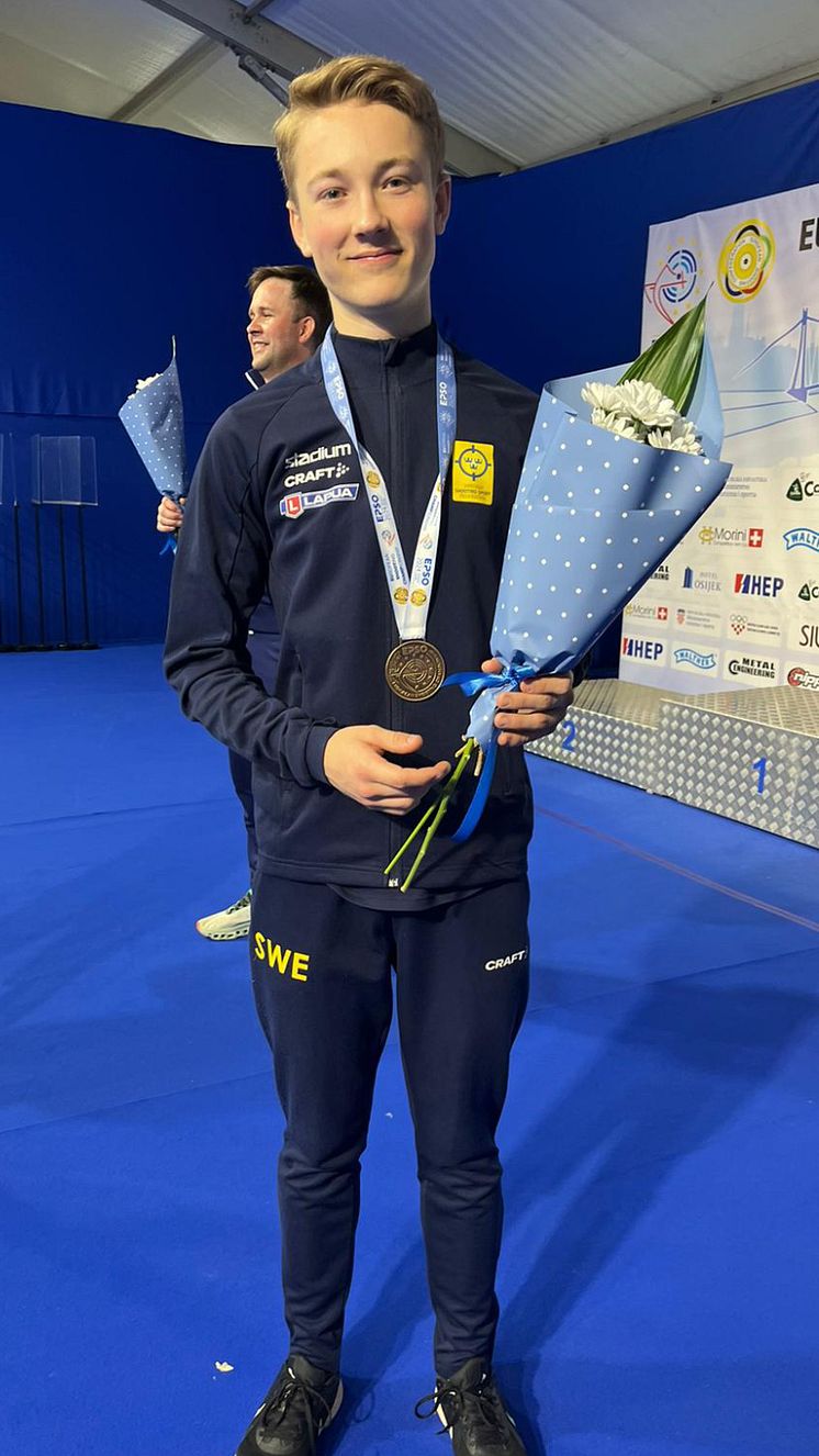 8-årige Jesper Johansson, från skånska Kävlinge, till med ett EM-brons i herrarnas 60 skott liggande på distansen 50 m.