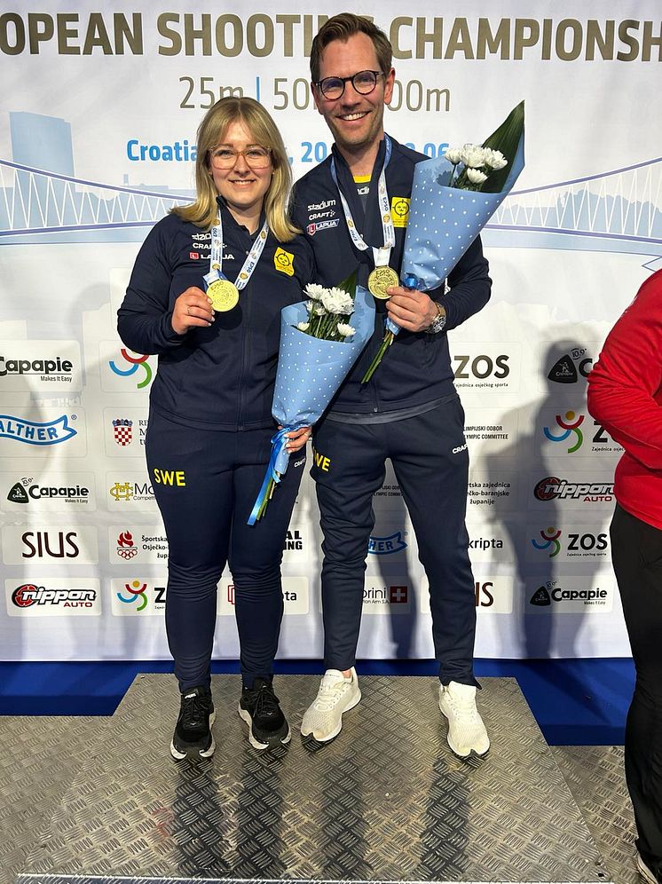 Karl Olsson och Elin Åhlin ordnade ett svenskt EM-guld efter finalvinst över Polen i dagens mixedduett på 300m ligg. Sveriges andra medalj i årets Europamästerskap i krutskytte i Osijek.