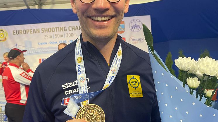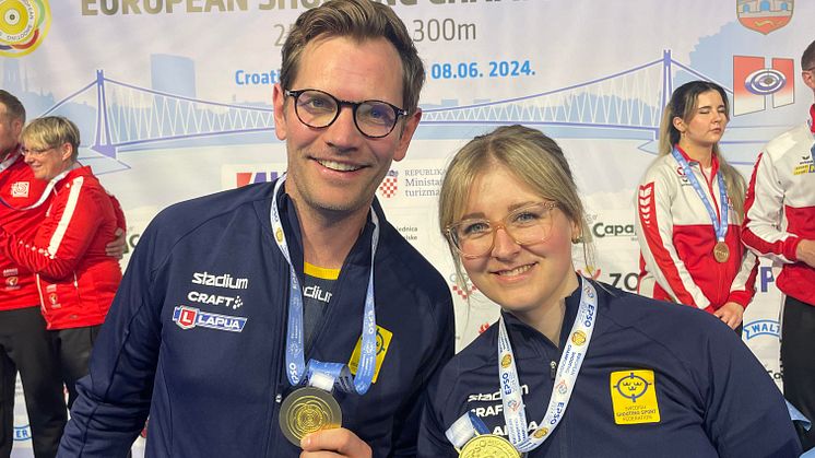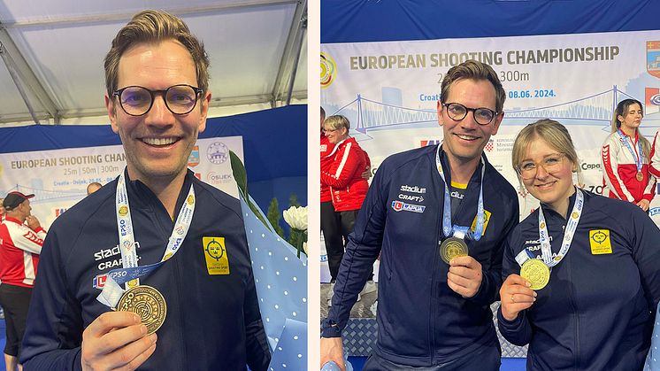 Det blev två nya svenska medaljer i krut-EM i Osijek och de svenska sportskyttarna är nu uppe i fyra medaljer totalt i årets Europamästerskap. På lördagsförmiddagen säkrade Karl Olsson sin tredje medalj i detta mästerskap genom att bli trea i 300m-grenen standardgevär. Och sent på eftermiddagen slog han och Elin Åhlin till igen i mixedklassen - precis som igår - och blev nu guldmedaljörer även i disciplinen 300m ställningsskytte. Alltså Kalles - och även Sveriges - fjärde EM-medalj under den här veckan i Kroatien.