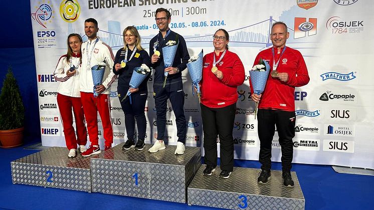 Efter några kämpiga individuella matcher de senaste dagarna lyckades Karl Olsson och Elin Åhlin samla kraft och revanschlusta till dagens EM-match i mixed/duett, liggande skytte på distansen 300 m. Den rutinerade svenskduon såg till att vara bäst när det gällde och kammade hem guldet efter finalvinst över Polen.
