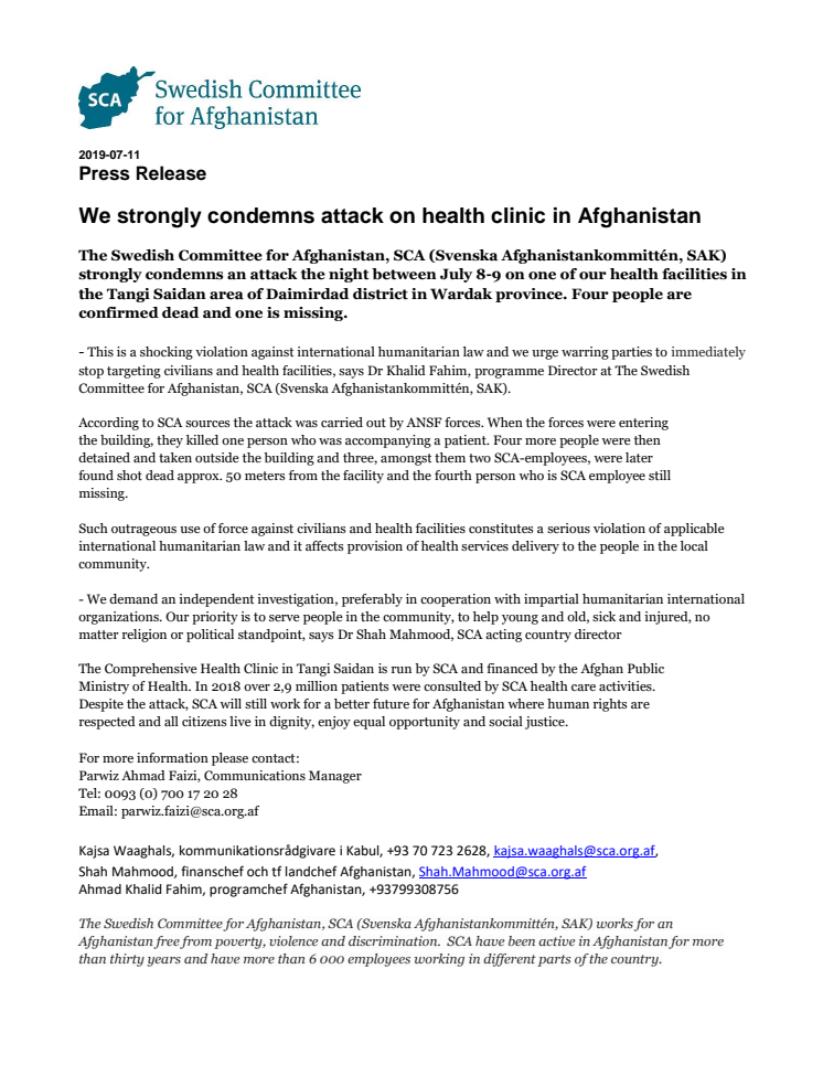 The Swedish Committee for Afghanistan, SCA (Svenska Afghanistankommittén, SAK) strongly condemns an attack the night between July 8-9 on one of our health facilities in the Tangi Saidan area of Daimirdad district in Wardak province. Four people are confirmed dead and one is missing.