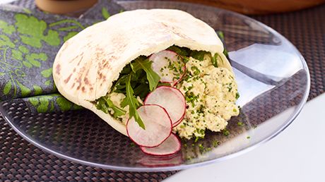 Plocka fram pitabröd, lite ruccola eller annan sallad och olivolja. Gör äggröra av äggen. Fyll brödet med äggröran, gärna smaksatt med hackad gräslök och lite skivade rädisor.