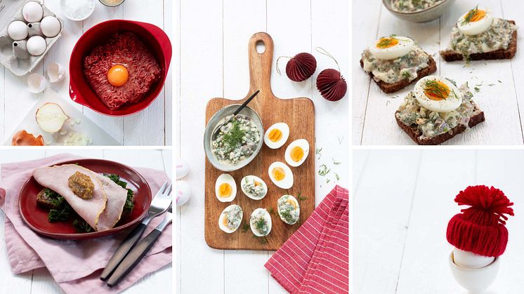 Att vi svenskar köper mycket ägg till jul är ganska naturligt. Ägg är en av kökets viktigaste råvaror både i julbaket och i matlagningen. Kanske lite av en doldis på julbordet, men spelar ändå huvudrollen i många rätter. Ägg är en självklar ingrediens vid griljering av julskinkan, i köttbullssmeten, i glasyren till pepparkakorna, i marängerna och mintkyssarna. Självklar stjärnglans får det också i klassiker som garnerade ägghalvor och gubbröra. Skulle det bli julmat över, knäck några ägg och svep in resterna i en fluffig omelett. Svinnsmart och gott!