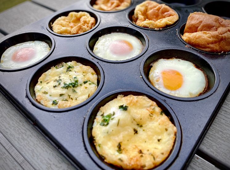 Gör du äggburgare med exempelvis sallad, dressing och ost som tillbehör funkar det med salt och peppar som enda smaksättning. Men det är också gott att göra äggmuffinsen mer matiga och smakrika med riven ost, tomater, lök, skinka eller svamp – här är det bara din fantasi som sätter gränser.