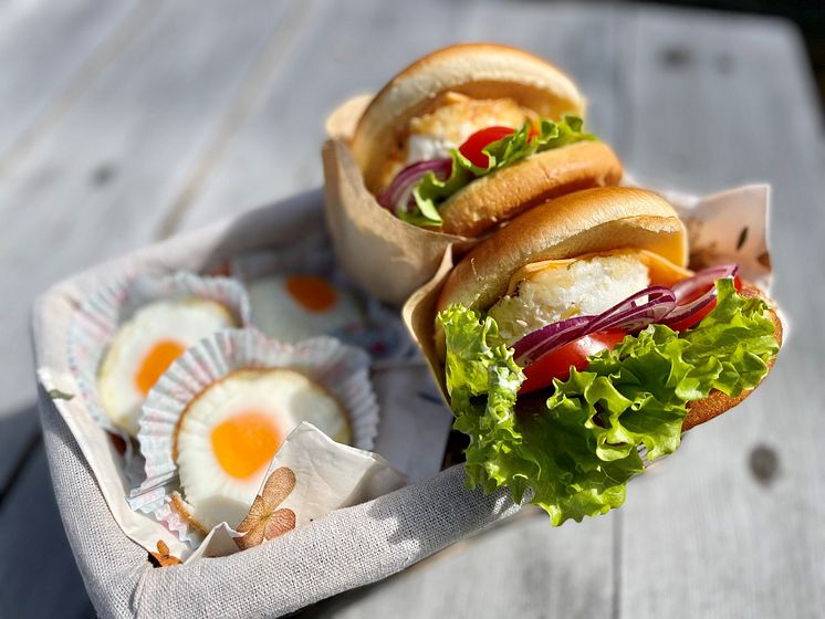 Du kan äta äggen med en grönsallad, till kött, korv eller ett vegetariskt alternativ – eller så kan du göra burgare och ta med till stranden eller på utflykten.