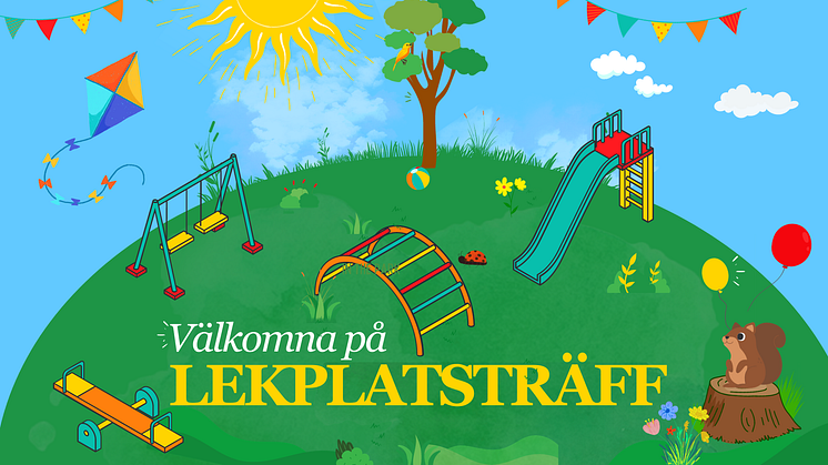 Illustrasjon av solig lekpark med texten "Välkomna på lekplatsträff"
