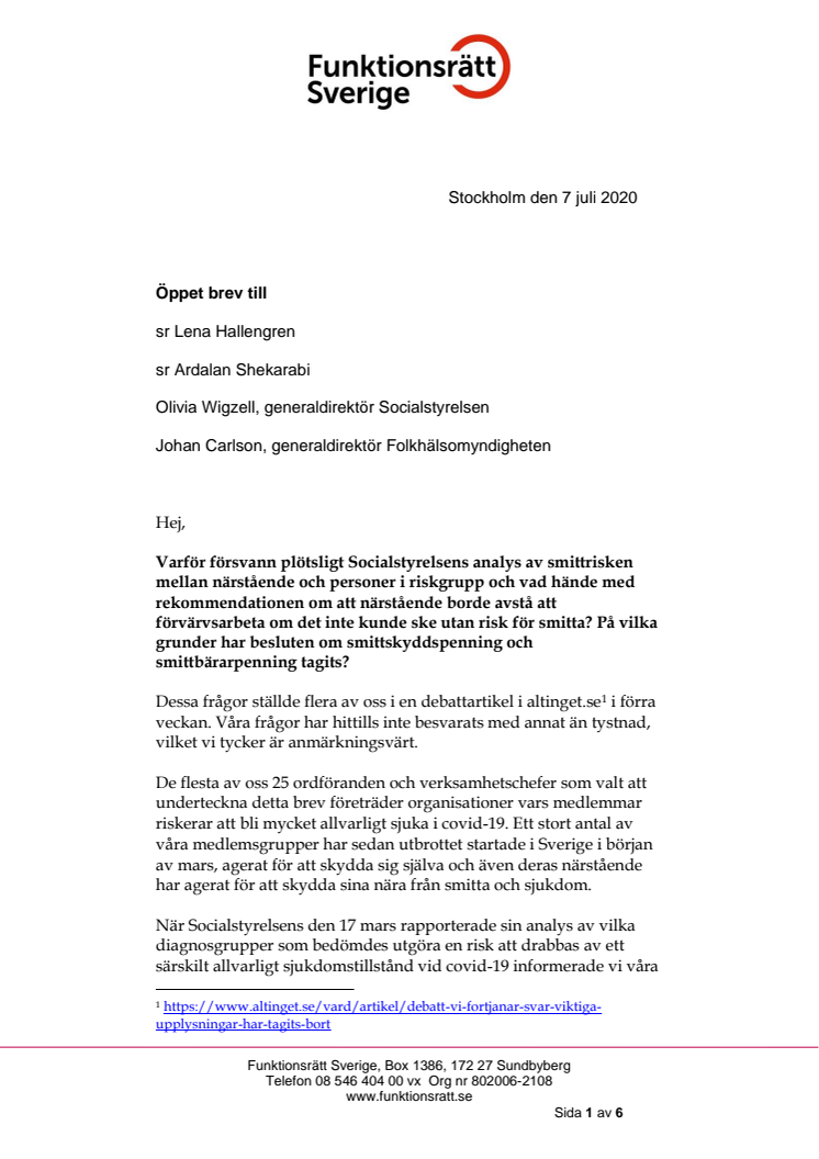 Varför försvann plötsligt Socialstyrelsens analys av smittrisken mellan närstående och personer i riskgrupp och vad hände med rekommendationen om att närstående borde avstå att förvärvsarbeta om det inte kunde ske utan risk för smitta? På vilka grunder har besluten om smittskyddspenning och smittbärarpenning tagits? Det undrar Funktionsrätt Sverige tillsammans med 24 andra organisationer.