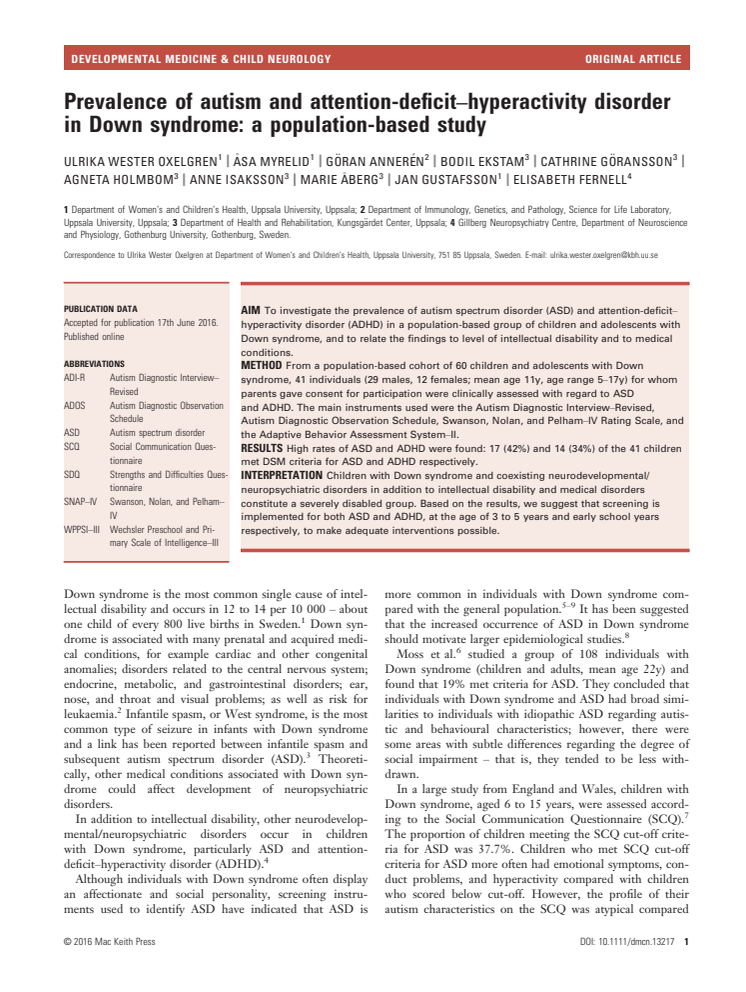 Dokument - 7 Februari 2017 ADHD och autismspektrumtillstånd vid Downs syndrom Studie av förekomsten av ADHD och autismspektrumtillstånd hos barn med Downs syndrom. go to media item Licens: © All rights reserved (nedladdning tillåten) Filformat: .pdf Ladda ner Ämnen Medicinsk forskning Mänskliga rättigheter Funktionsvariation Hälso-, sjukvård Kategorier ADHD och Autismspektrumtillstånd vid Downs syndrom