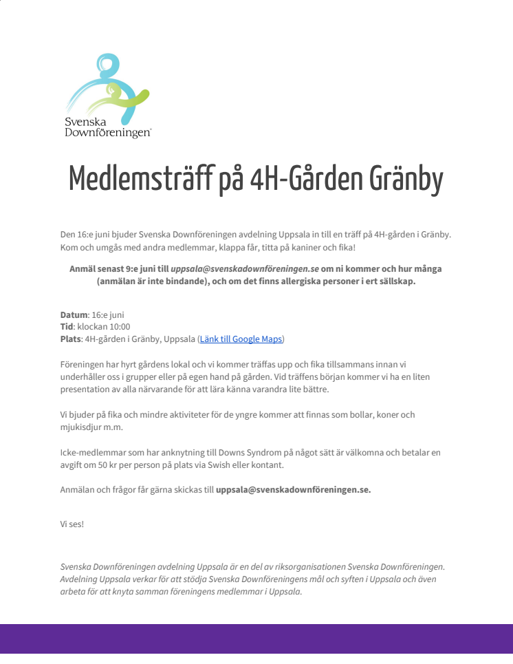Den 16:e juni bjuder Svenska Downföreningen avdelning Uppsala in till en träff på 4H-gården i Gränby. Kom och umgås med andra medlemmar, klappa får, titta på kaniner och fika!