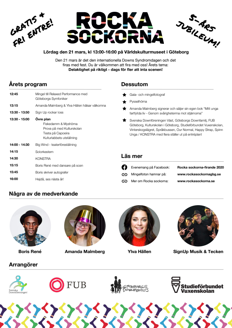 Här är programmet för rocka sockorna-firandet 21/3 i Göteborg. Skriv ut och sätt upp på förskolor, skolor, bibliotek, boenden och jobbet. Vi ses!