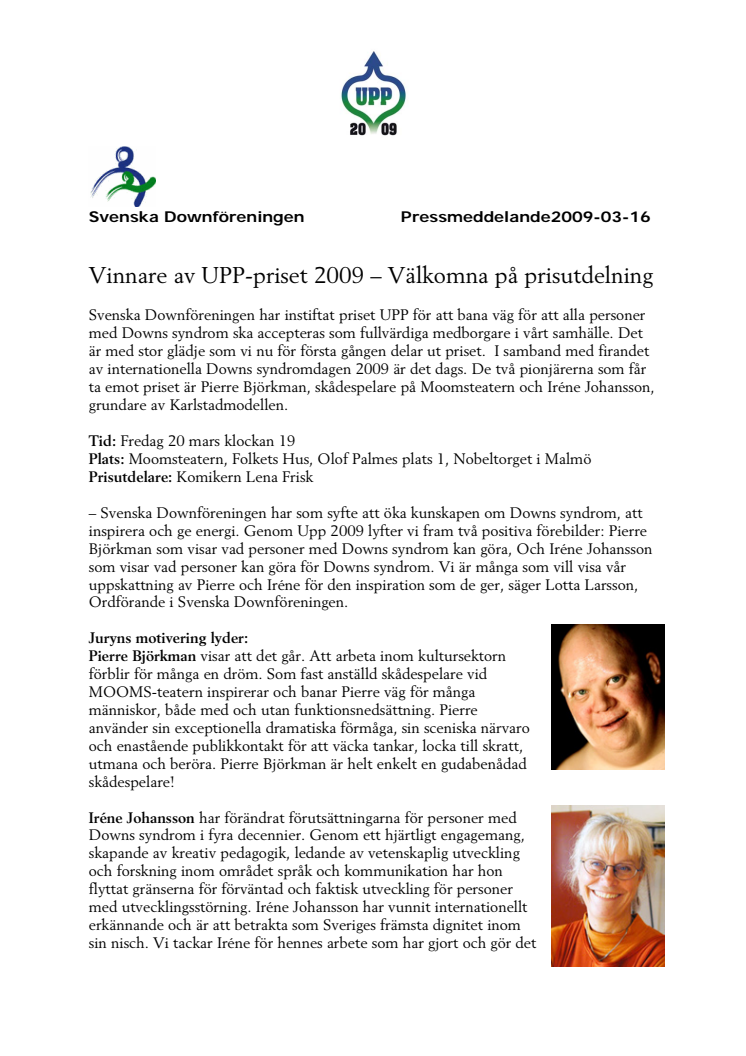 I samband med firandet av internationella Downs syndromdagen 2009 delar Svenska Downföreningen för första gången ut UPP-priset till två personer som betyder mycket för Downs syndrom. De två pionjärerna som får ta emot priset är Pierre Björkman, skådespelare på Moomsteatern och Iréne Johansson, grundare av Karlstadmodellen.