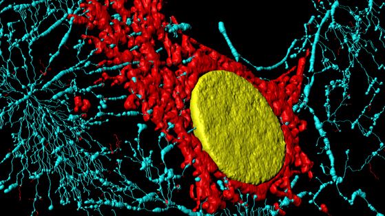 Wikimedia: Fibroblast (bindvävscell) där mitokondrierna är färgade röda och cellkärnan gul.