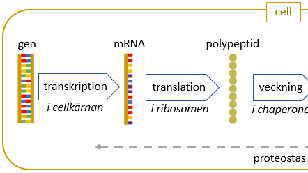 Nybildade proteiner som behöver transporteras, till någon organell i cellen eller ut ur cellen, byggs upp i det endoplasmatiska nätverket (ER), genom att ribosomen dockar där och sen matar ut polypeptiden inne i ER. Veckning av polypeptiden påbörjas direkt när den matas ut, och följs av olika modifieringar, med stöd av enzymer och chaperoner. Om något går fel så upptäcks det inne i ER och chaperoner försöker rätta till veckningen. Om det ändå inte går att få ordning på proteinets form, så för en särskild chaperon proteinet ut ur ER till cytosolen (cellvätskan). Där taggas proteinet med ubiquitin så att en proteasom fångar upp det och bryter ned det (Ubiquitin-Proteasom-Systemet – UPS).