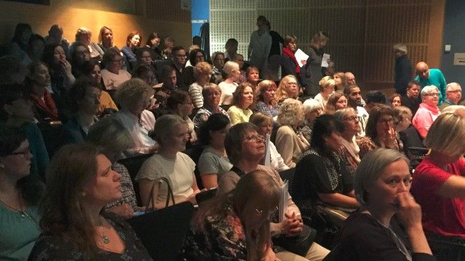 Leksell-salen var fullsatt på temadagen som anordnades av Centrum för Sällsynta Diagnoser vid Karolinska Universitetssjukhuset i samarbete med Svenska Downföreningen den 18 maj. Ett 30-tal av åhörarna var medlemmar i Svenska Downföreningen, och ett 100-tal var personal från gruppbostäder, dagliga verksamheter och habilitering. Kristina Gustafsson Bonnier från Karolinska hälsade alla välkomna, och Mickan Lüning presenterade Svenska Downföreningen.
