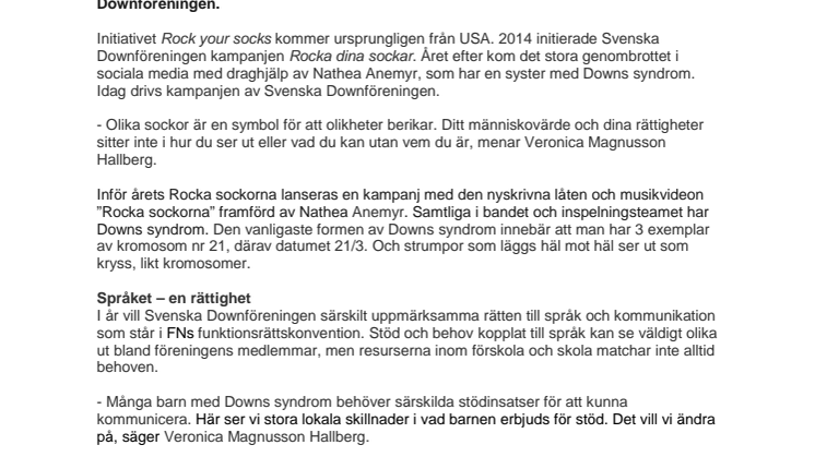 Med olika sockor på fötterna, sång och musik uppmärksammas Internationella Downs syndromdagen tisdagen den 21/3. Svenska Downföreningen som står bakom satsningen, uppmanar alla att rocka sockorna och slå ett slag för att olika är bäst!