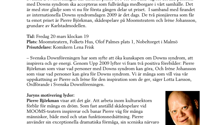 - Svenska Downföreningen har som syfte att öka kunskapen om Downs syndrom, att inspirera och ge energi. Genom Upp 2009 lyfter vi fram två positiva förebilder: Pierre Björkman som visar vad personer med Downs syndrom kan göra, Och Iréne Johansson som visar vad personer kan göra för Downs syndrom. Vi är många som vill visa vår uppskattning av Pierre och Iréne för den inspiration som de ger, säger Lotta Larsson, Ordförande i Svenska Downföreningen.