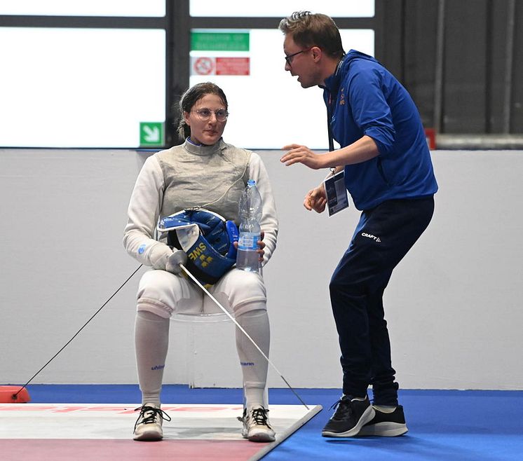 Ester Schreiber får coaching av sin tränare Henrik Lundegard under en paus i matchen mot Anabella Acurero Gonzalez från Venezuela som Ester vann för att kvala in till onsdagens tävling i damflorett. Foto: Andrea Alegni #bizziteam.