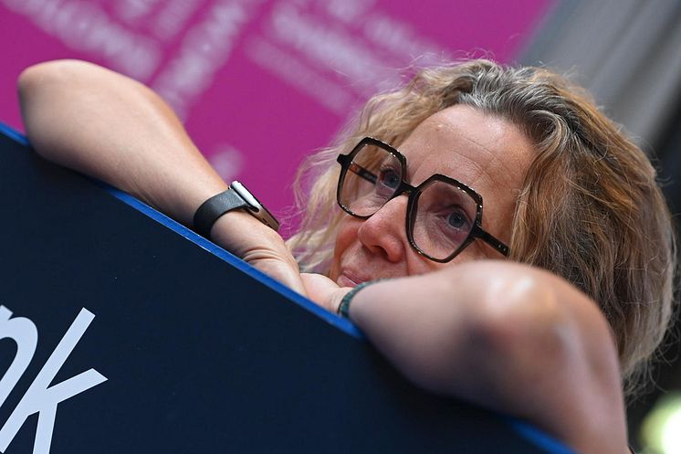 Fäktning-VM Milano 2023-07-25: Maria Elmfeldt Öhrskog, svensk förbundskapten på damvärja följer Emma Franssons match.