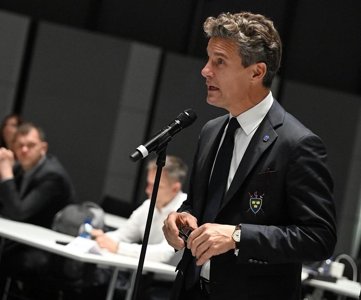 Otto Drakenberg, ordförande i Svenska Fäktförbundet vid FIE-kongressen 2021