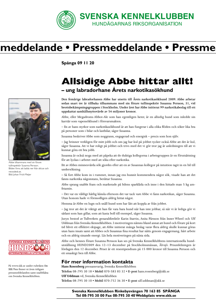 Den femårige labradorhanen Abbe har utsetts till Årets narkotikasökhund 2009. Abbe arbetar sedan snart tre år tillbaka tillsammans med sin förare tullinspektör Susanna Persson, 31, vid brottsbekämpningsgruppen i Stockholm. Under året har Abbe initierat 99 narkotikabeslag till ett uppskattat samhällsnyttovärde av 54 miljoner kronor.