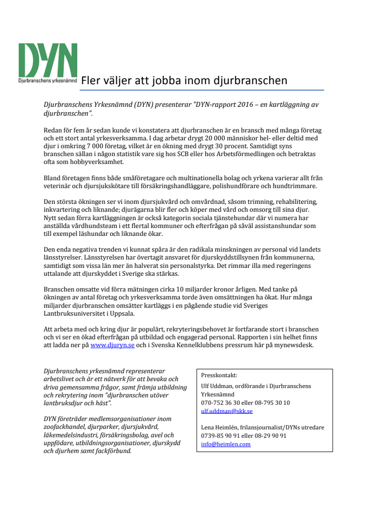 I en ny rapport konstaterar Djurbranschens Yrkesnämnd, DYN, att det i dag är drygt 20 000 människor som arbetar hel- eller deltid med djur i omkring 7 000 företag, vilket är en ökning med drygt 30 procent sedan 2011. Samtidigt syns branschen sällan i någon statistik vare sig hos SCB eller hos Arbetsförmedlingen och betraktas ofta som hobbyverksamhet.