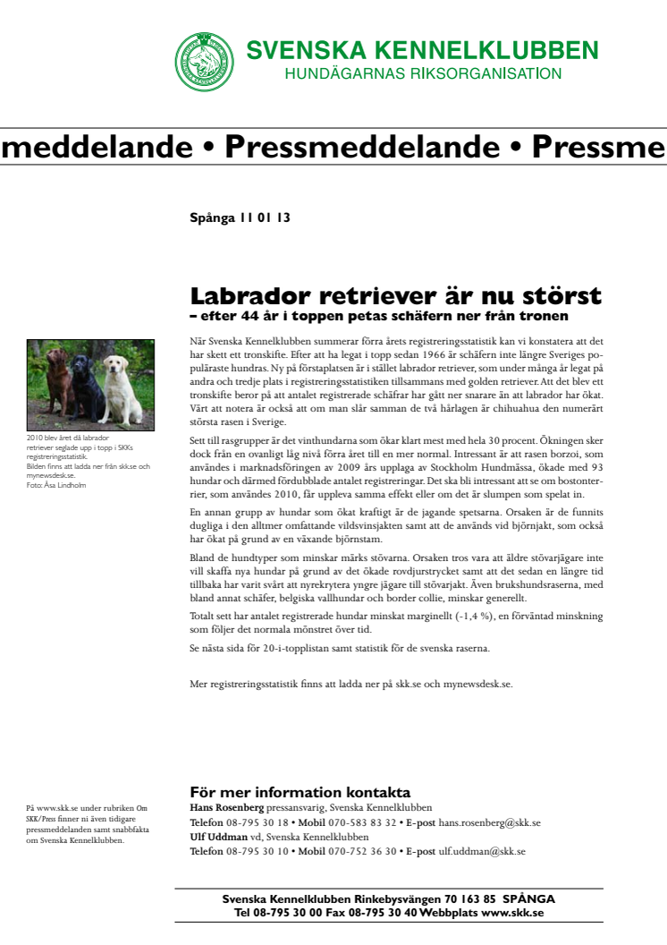 När Svenska Kennelklubben summerar förra årets registreringsstatistik kan vi konstatera att det har skett ett tronskifte. Efter att ha legat i topp sedan 1966 är schäfern inte längre Sveriges populäraste hundras. Ny på förstaplatsen är i stället labrador retriever, som under många år legat på andra och tredje plats i registreringsstatistiken tillsammans med golden retriever.