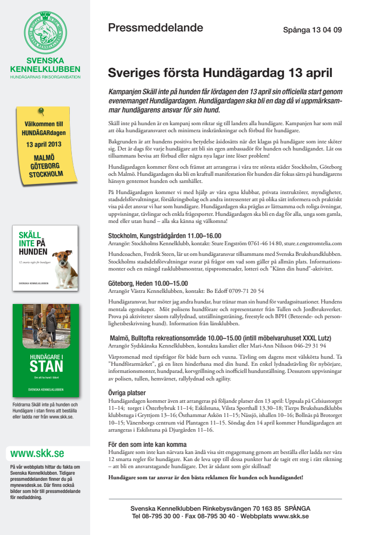 evenemanget Hundägardagen. På Hundägardagen kommer vi med hjälp av våra egna klubbar, privata instruktörer, myndigheter,stadsdelsförvaltningar, försäkringsbolag och andra intressenter att på olika sätt informera och praktiskt visa på det ansvar vi har som hundägare.