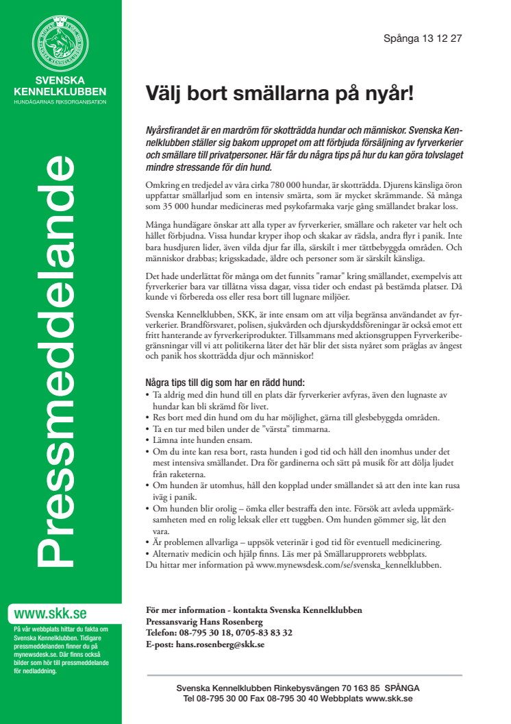 Nyårsfirandet är en mardröm för skotträdda hundar och människor. Svenska Kennelklubben ställer sig bakom uppropet om att förbjuda försäljning av fyrverkerier och smällare till privatpersoner. Här får du några tips på hur du kan göra tolvslaget mindre stressande för din hund.