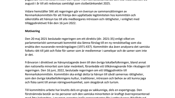 Vidare hemställer SKK att regeringen gör en översyn av sammansättningen av Renmarkskommittén för att främja den uppfattade legitimiteten hos kommittén och säkerställa att hänsyn tas till alla medborgares intressen och rättigheter, i enlighet med tilläggsdirektivet från den 16 juni 2022.