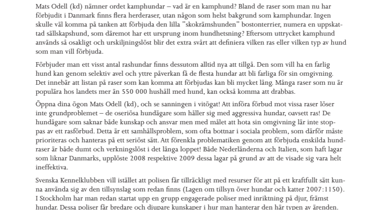 Människor i vårt land ska känna sig trygga i mötet med hund! Aggressiva hundar är absolut den sämsta reklamen för hunden och hundägandet, och varje olycka är en olycka för mycket! Hade problemet med bitande hundar lösts med ett rasförbud hade Svenska Kennelklubben som hundägarnas riksorganisation redan för 20 år sedan gått i bräschen för en sådan lag. Mats Odell (kd) nämner ordet kamphundar – vad är en kamphund? Bland de raser som man nu har förbjudit i Danmark finns flera herderaser, utan någon som helst bakgrund som kamphundar. Ingen skulle väl komma på tanken att förbjuda den lilla "skokrämshunden" bostonterrier, numera en uppskattad sällskapshund, som däremot har ett ursprung inom hundhetsning? Eftersom uttrycket kamphund används så osakligt och urskiljningslöst blir det extra svårt att definiera vilken ras eller vilken typ av hund som man vill förbjuda. Förbjuder man ett visst antal rashundar finns dessutom alltid nya att tillgå. Den som vill ha en farlig hund kan genom selektiv avel och yttre påverkan få de flesta hundar att bli farliga för sin omgivning. Det innebär att listan på raser som kan komma att förbjudas kan bli mycket lång. Många raser som nu är populära hos landets mer än 550 000 hushåll med hund, kan också komma att drabbas. Öppna dina ögon Mats Odell (kd), och se sanningen i vitögat! Att införa förbud mot vissa raser löser inte grundproblemet – de oseriösa hundägare som håller sig med aggressiva hundar, oavsett ras! De hundägare som saknar både kunskap och ansvar men med målet att hota sin omgivning lär inte stoppas av ett rasförbud. Detta är ett samhällsproblem, som ofta bottnar i sociala problem, som därför måste prioriteras och hanteras på ett seriöst sätt. Att förenkla problematiken genom att förbjuda enskilda hundraser är både dumt och verkningslöst i det långa loppet! Både Nederländerna och Italien, som haft lagar som liknar Danmarks, upplöste 2008 respektive 2009 dessa lagar på grund av att de visade sig vara helt ineffektiva. Svenska Kennelklubben vill istället att polisen får tillräckligt med resurser för att på ett kraftfullt sätt kunna använda sig av den tillsynslag som redan finns (Lagen om tillsyn över hundar och katter 2007:1150). I Stockholm har man redan startat upp en grupp engagerade poliser med inriktning på djur, främst hundar. Dessa poliser får bredare och djupare kunskaper i hur man hanterar den här typen av ärenden. Genom sin synlighet ger de trygghet och möjlighet att möta hundägarna på plats. De ska snabbt kunna ingripa och använda den tillsynslag som finns i dag. Denna lag hänger inte upp sig på en viss ras utan är utformad för att gälla den specifika hund som är farlig och den hundägare som är en klart olämplig hundägare. Att en politiker uttalar sig i en fråga som han så uppenbart inte har någon kunskap om är skrämmande. Att en politiker dessutom vill åtgärda de egentliga problemen med en "plåsterlapp" är helt enkelt oseriöst. Kom gärna med förslag på lösningar, men ett rasförbud är inte en lösning! Hans Rosenberg