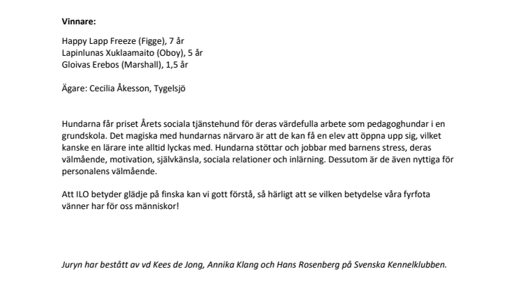 Utmärkelsen Årets sociala tjänstehund 2022 delas av tre finska lapphundar som arbetar som pedagoghundar i en lågstadieskola i Lund. Figge, Oboy och Marshall i Team Ilo stärker barnens välmående och har i flera fall varit avgörande för att eleverna ska lyckas i skolan.