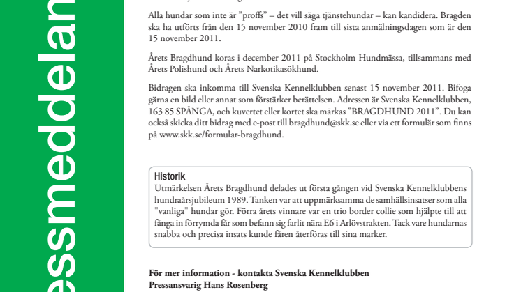 Bidragen ska inkomma till Svenska Kennelklubben senast 15 november 2011. Bifoga gärna en bild eller annat som förstärker berättelsen. Adressen är Svenska Kennelklubben, 163 85 SPÅNGA, och kuvertet eller kortet ska märkas ”BRAGDHUND 2011”. Du kan också skicka ditt bidrag med e-post till bragdhund@skk.se eller via ett formulär som finns på www.skk.se/formular-bragdhund.