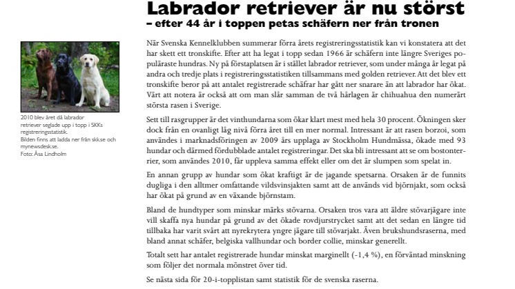 När Svenska Kennelklubben summerar förra årets registreringsstatistik kan vi konstatera att det har skett ett tronskifte. Efter att ha legat i topp sedan 1966 är schäfern inte längre Sveriges populäraste hundras. Ny på förstaplatsen är i stället labrador retriever, som under många år legat på andra och tredje plats i registreringsstatistiken tillsammans med golden retriever. Att det blev ett tronskifte beror på att antalet registrerade schäfrar har gått ner snarare än att labrador har ökat. Värt att notera är också att om man slår samman de två hårlagen är chihuahua den numerärt största rasen i Sverige.
