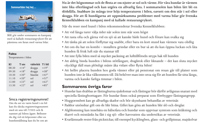 Nu är det högsommar och de flesta av oss njuter av sol och värme. För våra hundar är värmen inte lika efterlängtad och kan utgöra en allvarlig fara. I sommarsolen kan bilen lätt bli en dödsfälla. Snabbare än många tror höjs temperaturen i bilen, oavsett om den står i sol eller skugga. För att få hundägarna att uppmärksamma problemet med varma bilar gör Svenska Kennelklubben en kampanj med så kallade restaurangvykort.